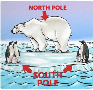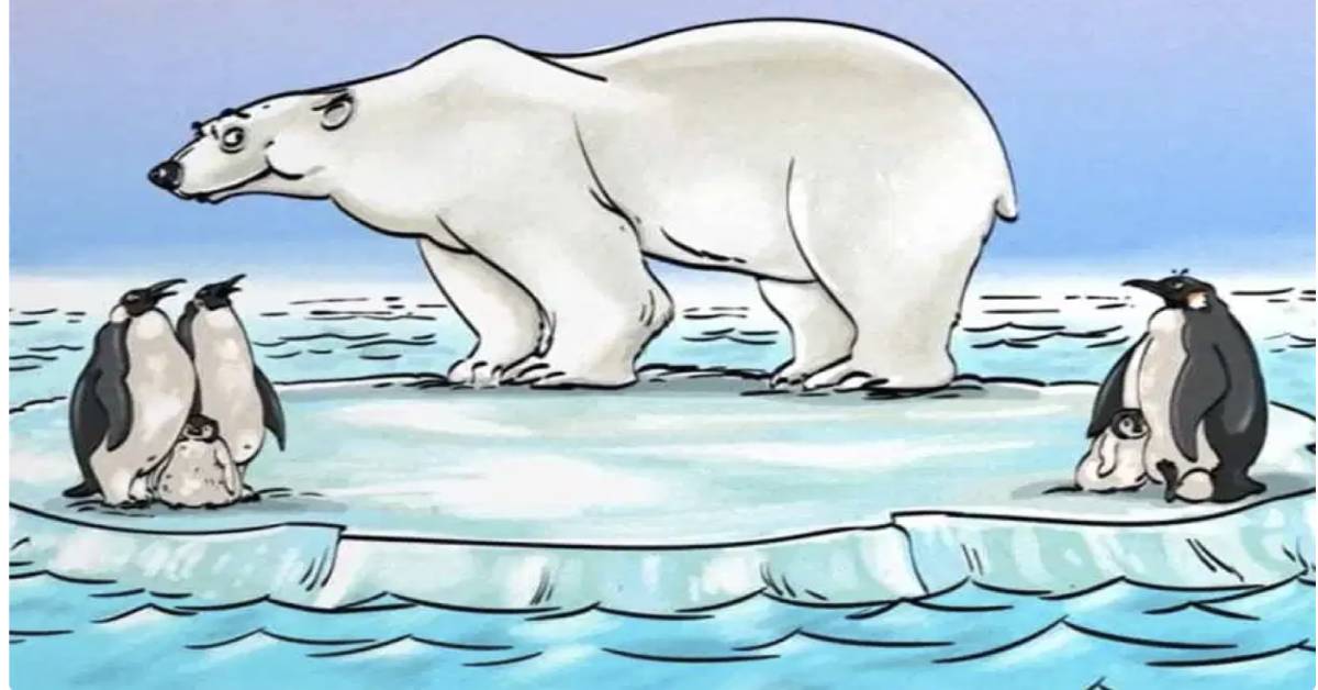 Alright, first things first, here is an image featuring a polar bear upon a block of ice. In the same way, he’s surrounded by a series of penguins too. While everything appears to be picture-perfect, it’s really not!