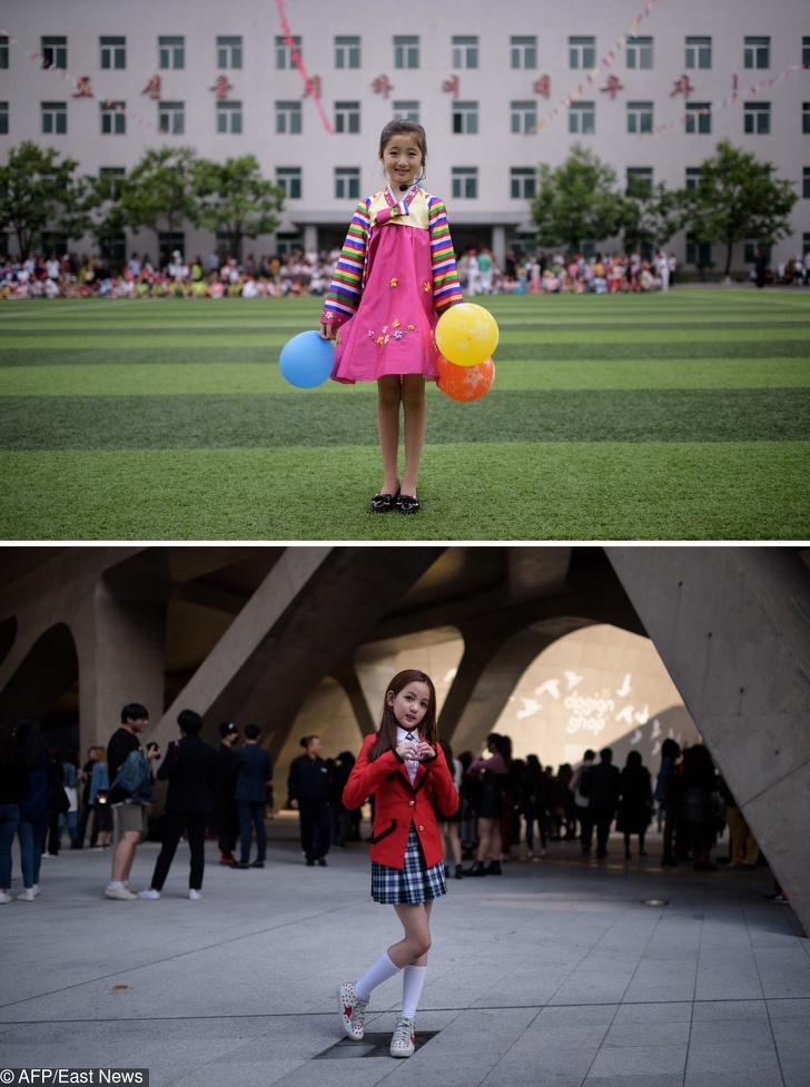 5. A schoolgirl, 9, celebrating Children Day at her school in Pyongyang and a South Korean girl, 10, at Seoul Fashion Week.