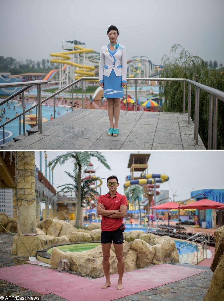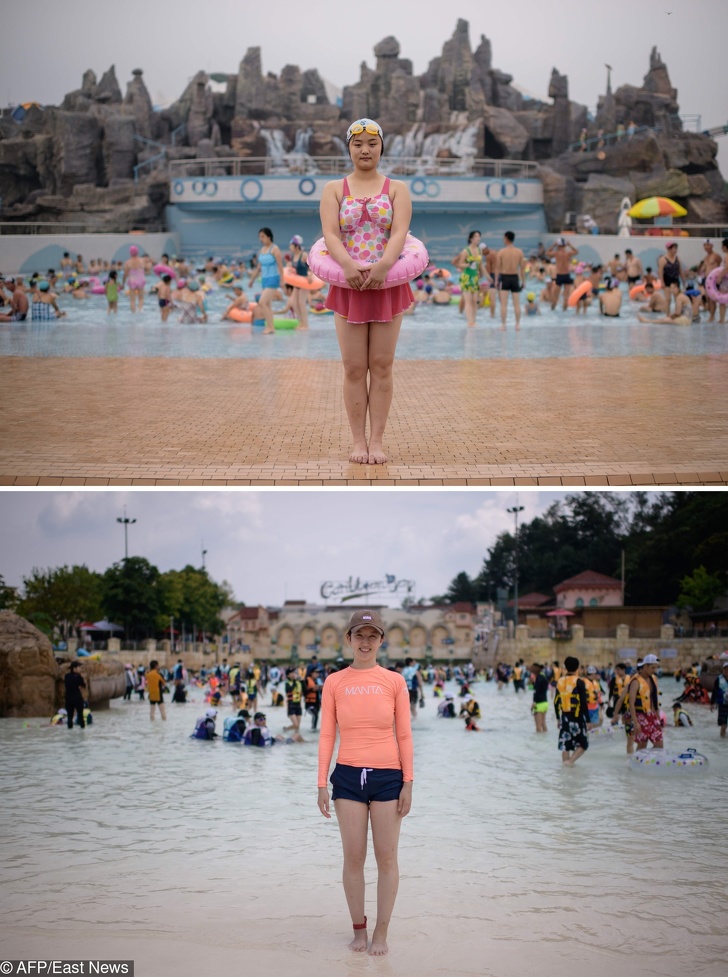 12. A woman visiting the Munsu Water Park in Pyongyang and a visitor at the Caribbean Bay Water Park in Seoul.