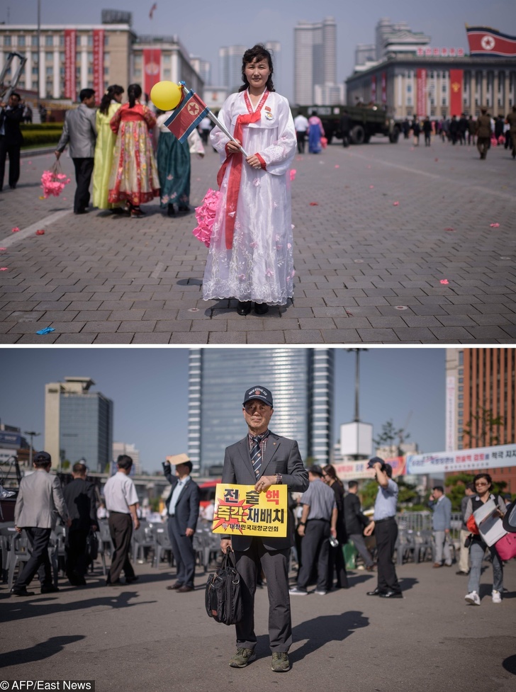 10. A woman at a military parade on Kim Il-sung square in North Korea and a retired South Korean Rear Admiral recording his protest against nuclear weapons.