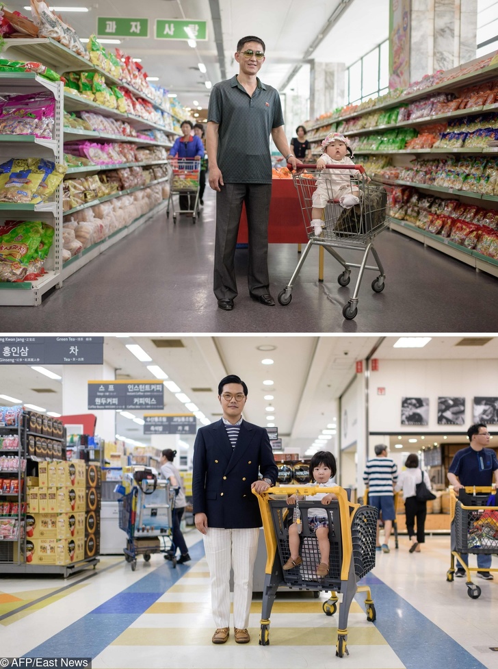 7. Customers buying grocery at supermarkets in Pyongyang and Seoul.