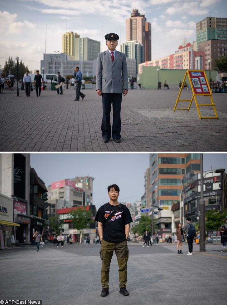 15. A North Korean student, 23, at the city square, Pyongyang, and his 24-year-old counterpart in Seongdong-gu, Seoul.