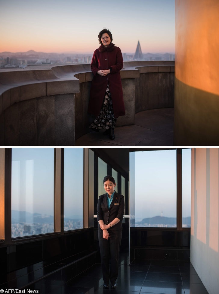 14. A tour guide standing on Tower of the Juche Idea in Pyongyang and her counterpart standing on the view deck of 63 Building in Seoul.