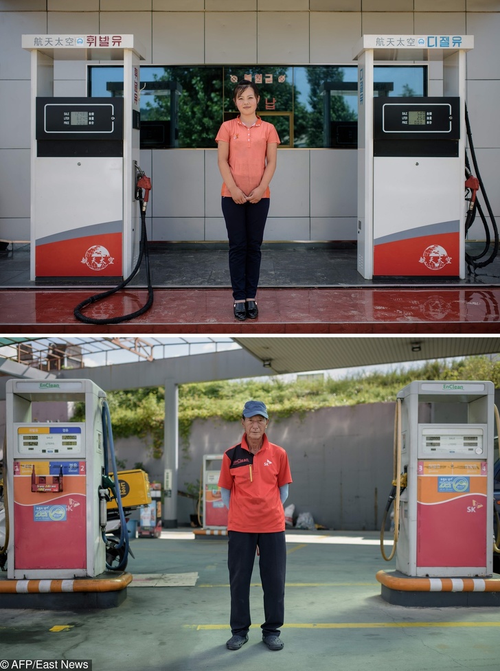 13. A gas station worker in North Korea and her South Korean counterpart.