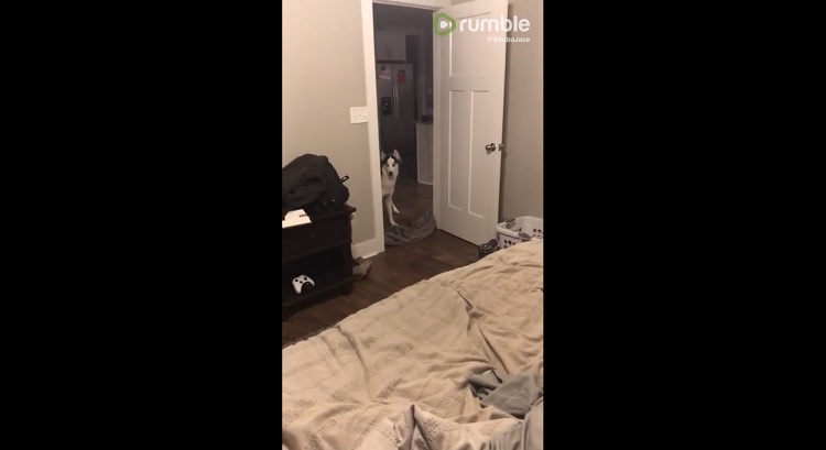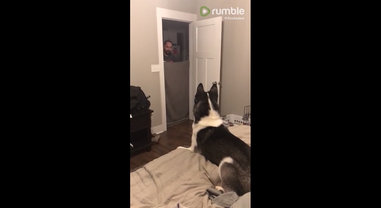 In this case, the dog in question is a Husky named Roxy. She sits attentively in front of her owner who is holding a blanket while standing in the doorway. He raises the blanket and drops it and he’s gone!