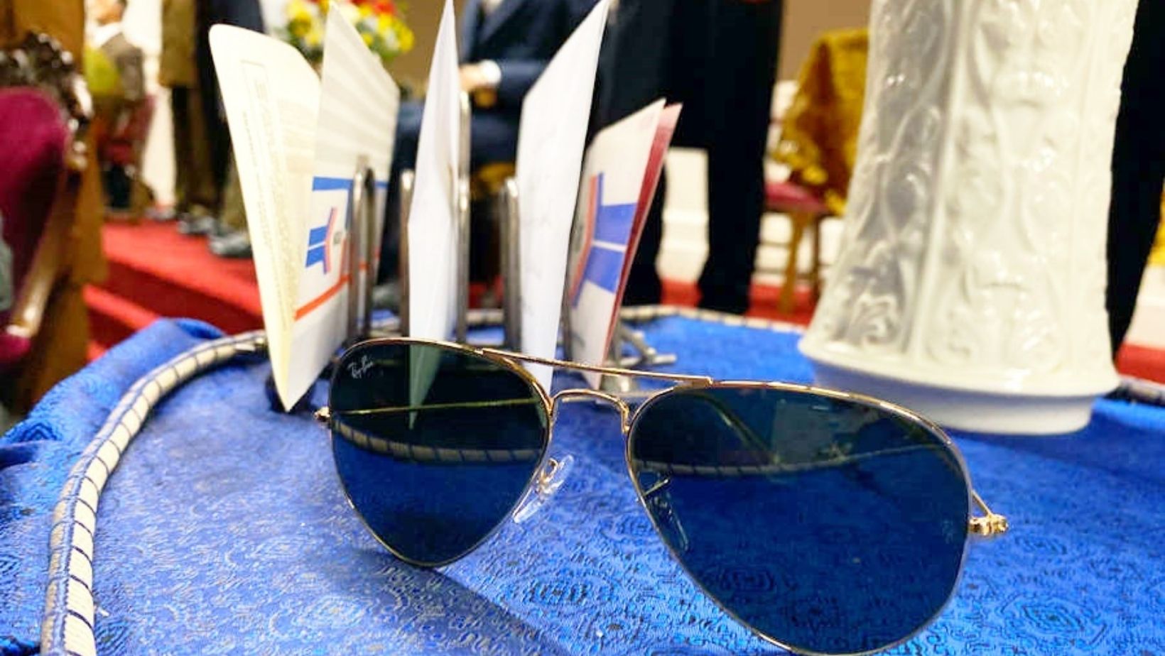 Next to the figure, on a table, is a series of signature items including a pair of Biden’s aviator sunglasses, a bundle of Amtrak tickets in a nod to his days as a commuter in the Senate, and a vase of peach blossom, the 78-year-old’s home state of Delaware.