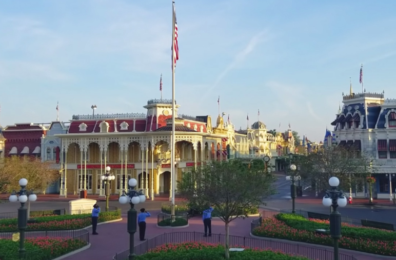 After four days of its announcement of shutdown due to the spread of coronavirus, Josh D’Amaro, the President of Walt Disney World Resort shared a video where employees can be seen raising the American flag inside the park in the courtyard located at the entrance of Main Street, USA.