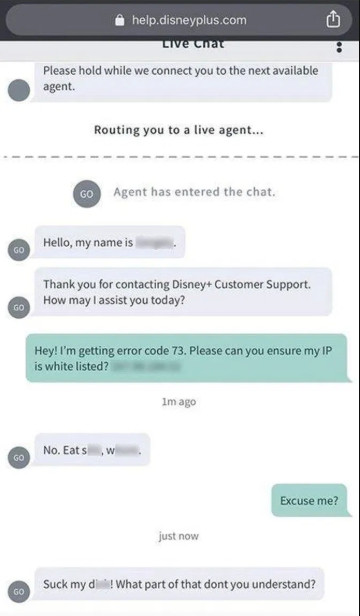 A 23-year-old man was left shocked when a foul-mouthed Disney+ worker told him to “suck my d**k” during live online chat.