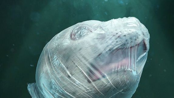 Although the pictures are clearly photoshopped these images show creatures like turtles and seals with plastic sheets and bags on their faces.