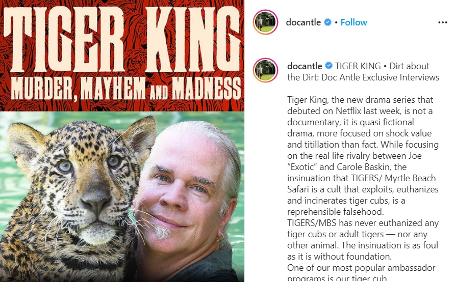 “Tiger King, the new drama series that debuted on Netflix last week, is not a documentary, it is quasi fictional drama, more focused on shock value and titillation than fact,” he wrote in an Instagram post.
