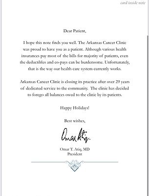 Hunter Hoagland of KARK4 News posted a photo of the card on social media, which reads: “I hope this note finds you well. The Arkansas Cancer Clinic was proud to serve you as a patient.