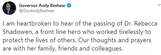 Kentucky Gov. Andy Beshear paid tribute to Dr. Shadowen, writing: “I am heartbroken to hear of the passing of Dr. Rebecca Shadowen, a front line hero who worked tirelessly to protect the lives of others.”