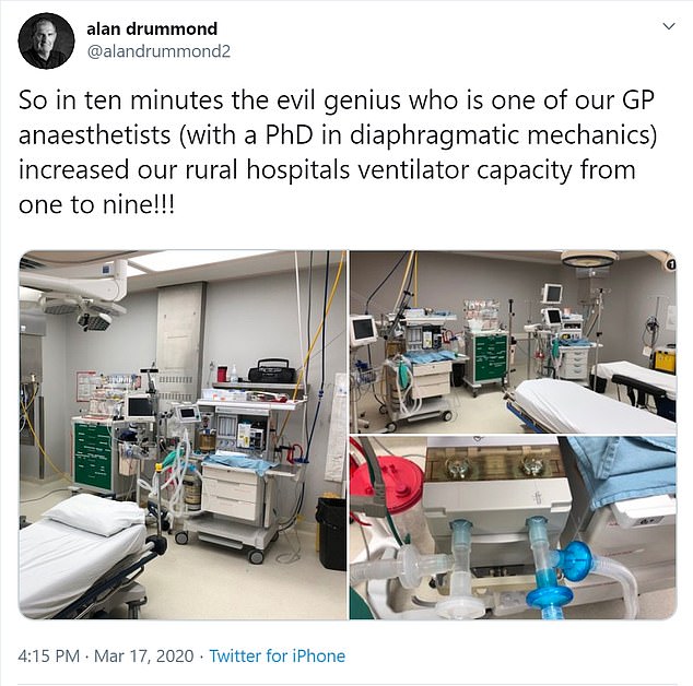 Alan Drummond, Dr. Gauthier’s colleague, shared pictures of the 9-in-1 ventilator on Twitter. He wrote: “So in ten minutes the evil genius who is one of our GP anesthetists (with a PhD in diaphragmatic mechanics) increased our rural hospitals ventilator capacity from one to nine!!!”