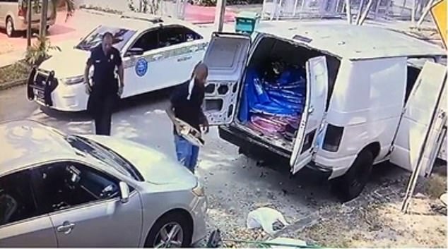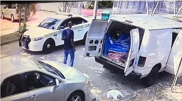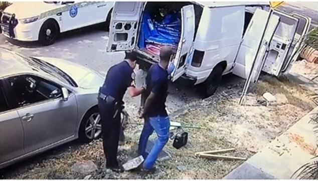 A security camera outside Henderson’s home in Miami, Florida captured the moment the police officer handcuffed the doctor.