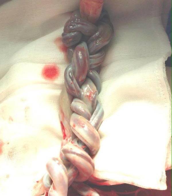 The two placentas were tightly braided together! It was unbelievable just how the tangled cords did not cause any harm to the babies. It was unbelievable!
