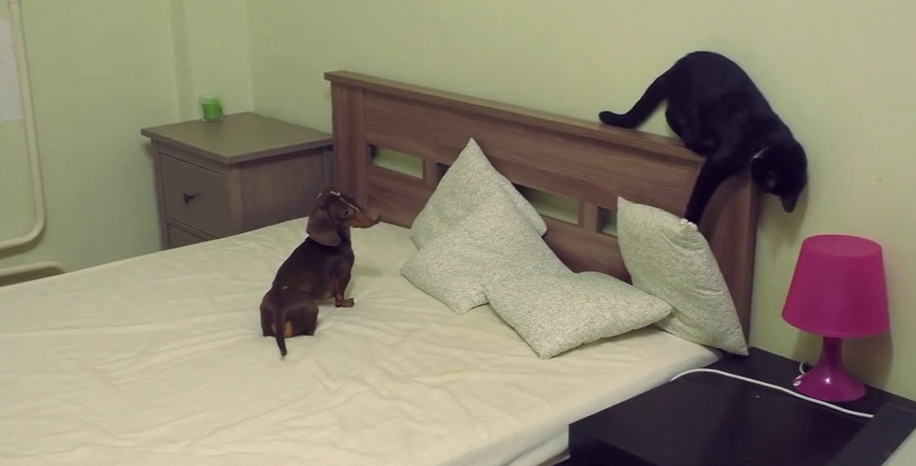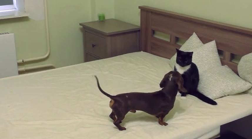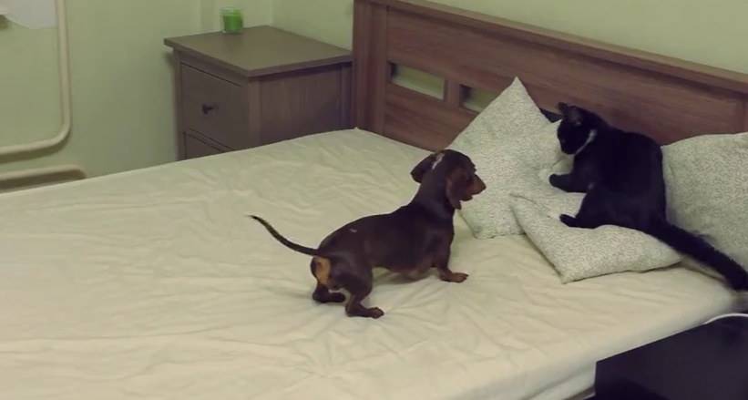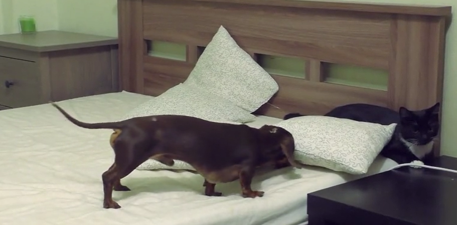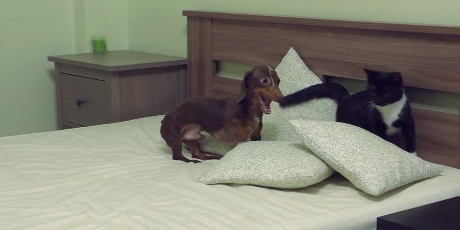 Here is a video of a similar scene where Pepper the Dachshund dog is pissed at Eva the cat because Eva is trying to take away the pillows and he is not going to allow Eva to do it.