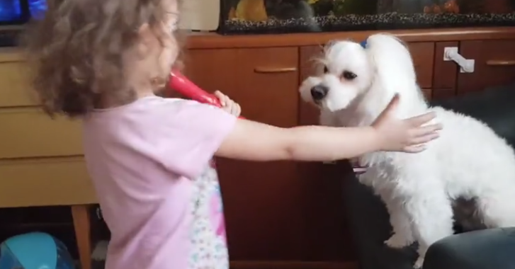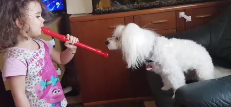 The parents recorded this fantastic moment shared between both of them, and it is the cutest performance ever. The kid came was preparing her red toy recorder while the dog was waiting for her performance to start.