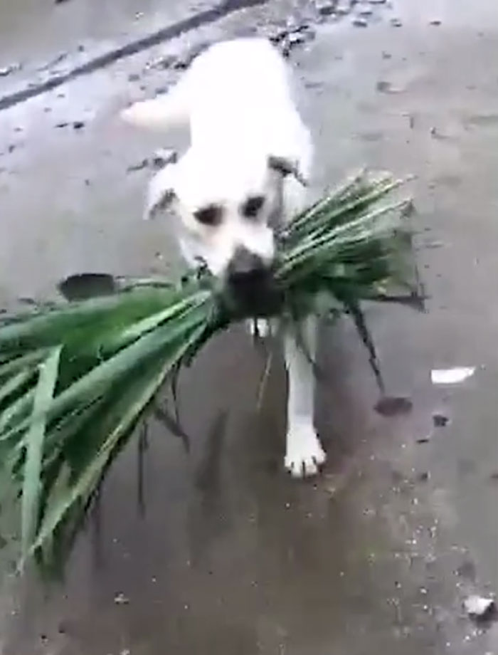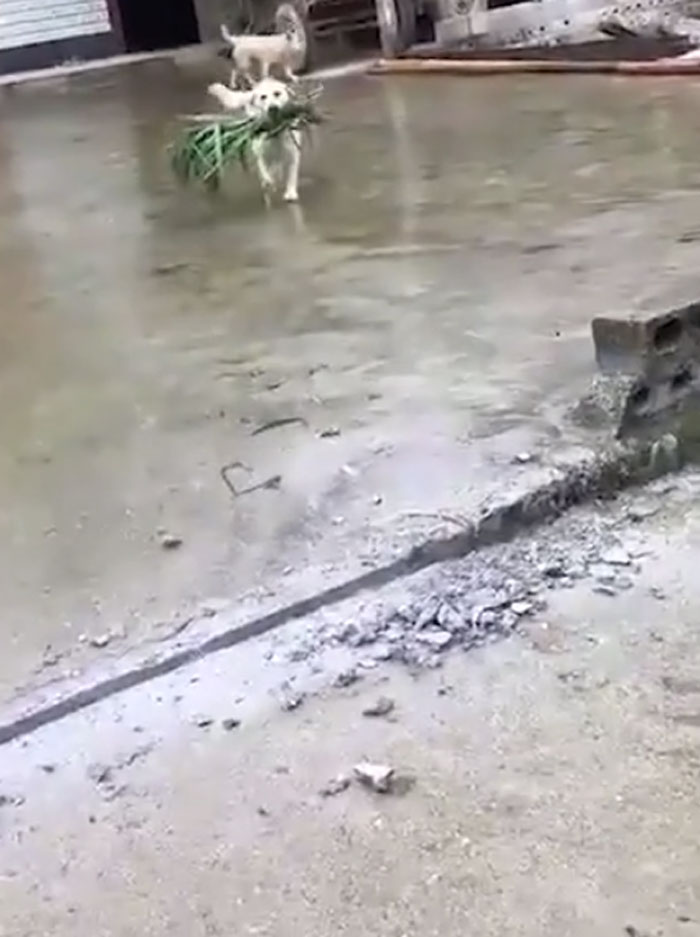 The dog then grabs a bundle of grass for his buffalo friend and puts the grass bundle in the buffalo’s trough.