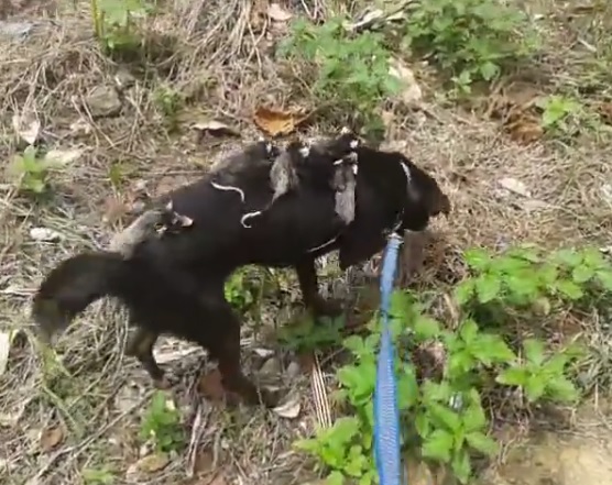 Throughout the walk, the opossums are seen firmly holding onto the pooch and not letting go even as the dog lies on the ground to take a rest.