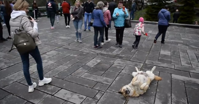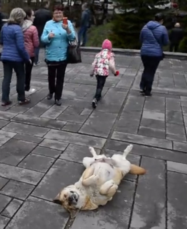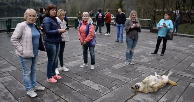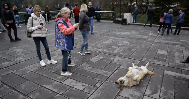 To get tourists attention, this husky decided to lie on her back to catch everyone’s attention.
