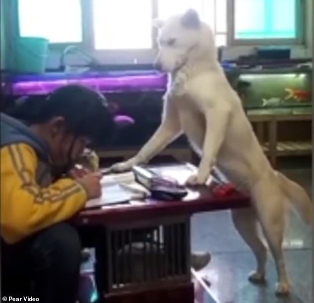 The genius father surnamed Xu in south-west China has trained his pet mongrel to supervise his daughter who wouldn’t stop checking her phone while writing her assignments at their home in Guiyang, Guizhou province.
