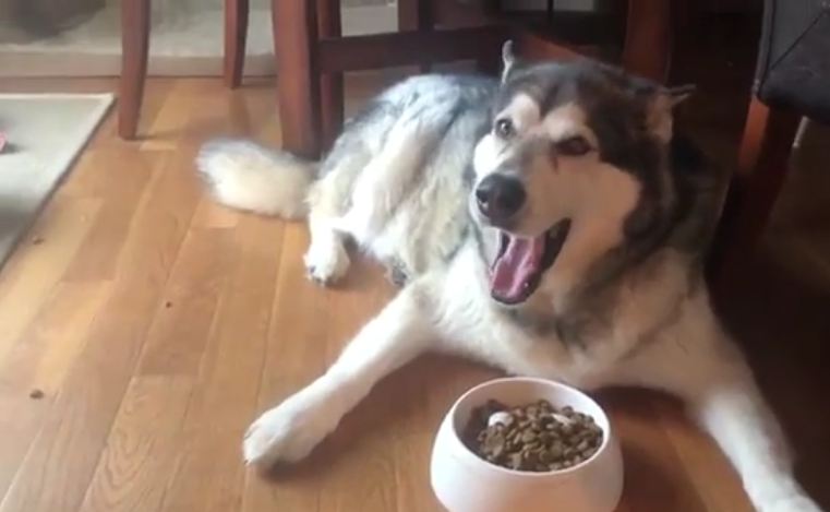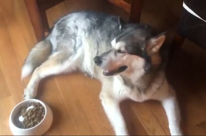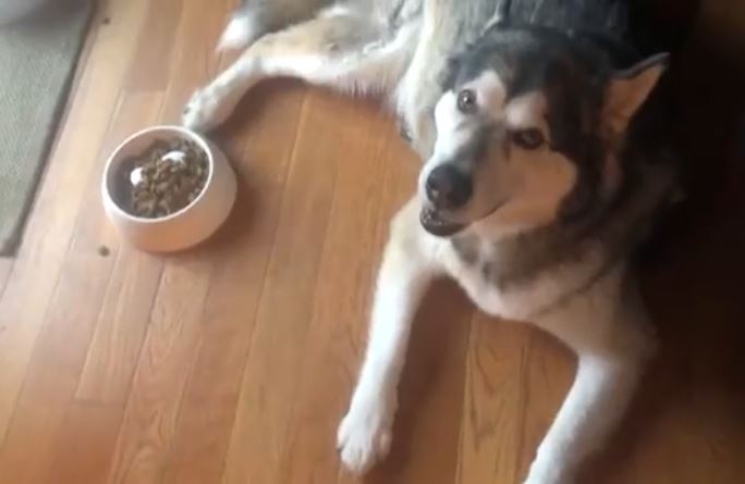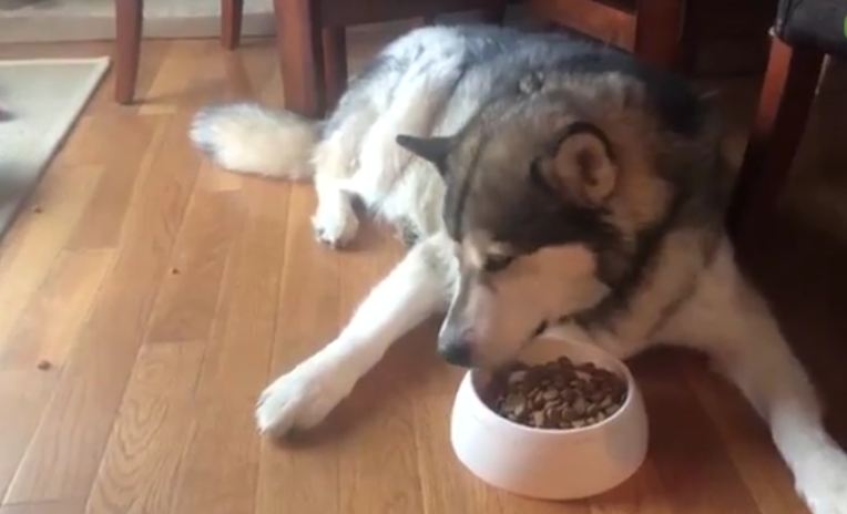 Even after that, he takes a few seconds to finally eat his food out of the bowl.