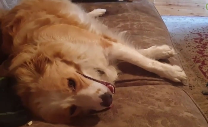 The video shows the little girl treating her dog with her first aid kit while the dog is lying on the floor.