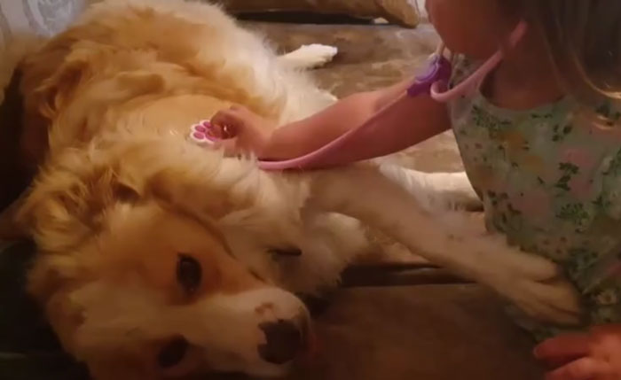 An adorable video footage has emerged that shows a toddler treating her dog with her first aid kit while the dog pretends to be sick.