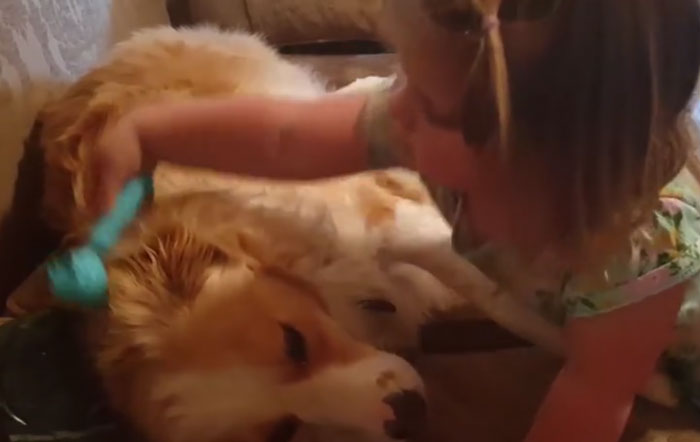 In the video, the little girl can be seen grooming her dog friend who is loving the salon session.