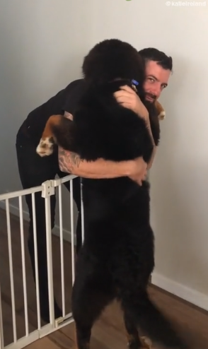 This Bernese Mountain dog stood on his back legs to hug his owner tightly. The owner claims that this is not just a one-time thing as the dog hugs him every day when he comes back home.