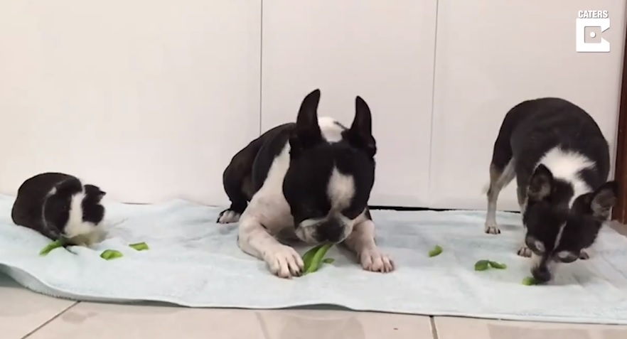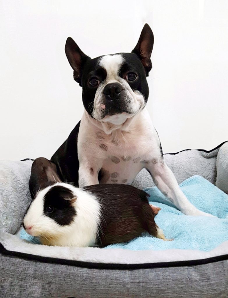 A dog and guinea pig with identical markings have gone viral after their owner revealed they have become best buddies just as if they were real siblings.