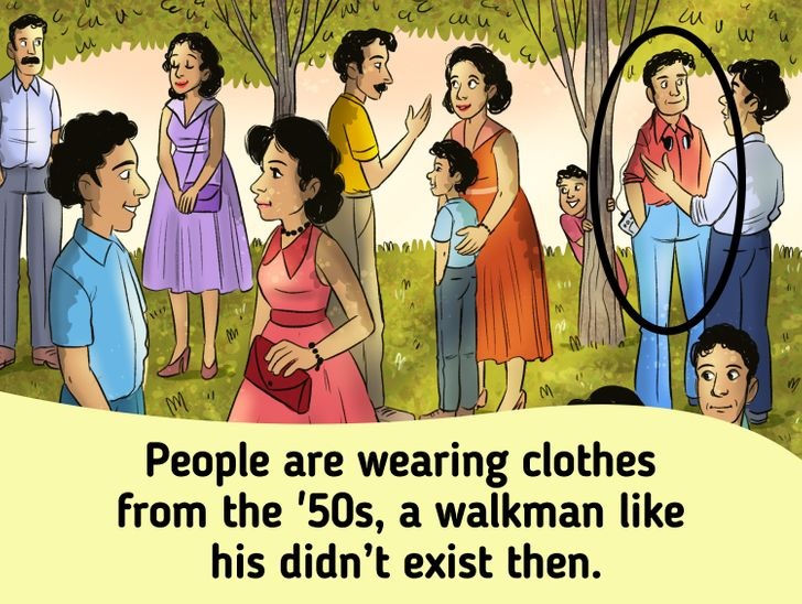 Can you spot the hidden clue and solve the mystery? Here’s a hint: the person from the future is wearing something that didn’t exist in the 50s!
