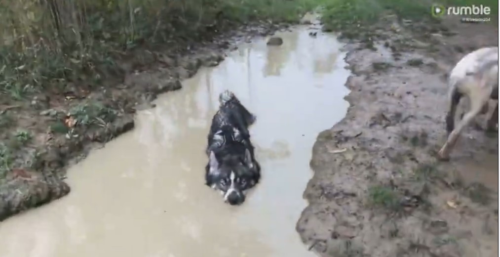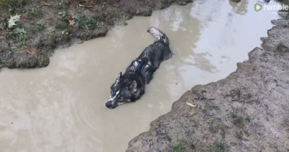 It can be clearly seen in the video that the dog has covered his whole body in the mud, keeping his head out like a crocodile, and even not moving and keeping his body still in a big pile of mud.