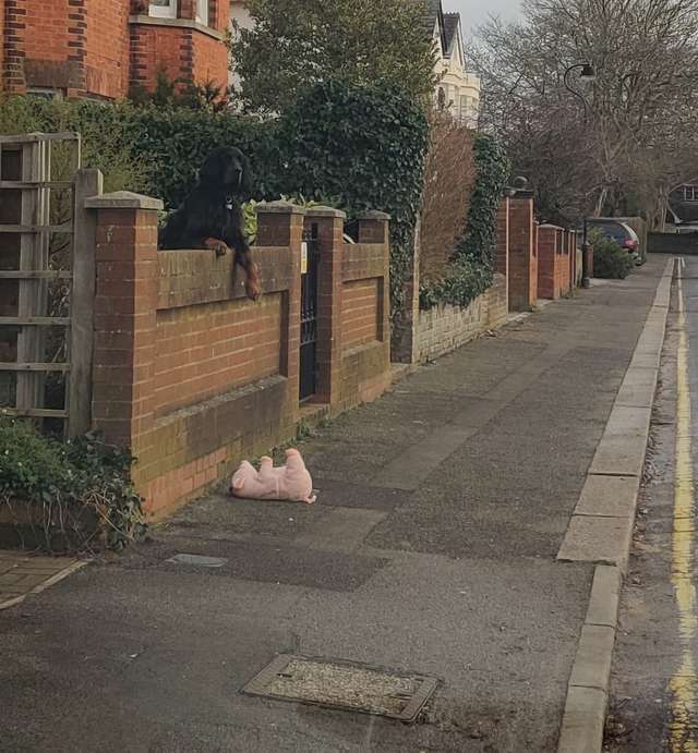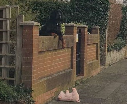 As Claire Cummings revealed, she was on the way to visit her friend when she saw a huge dog leaning on the fence of his home and looking down at the toy he accidentally dropped.