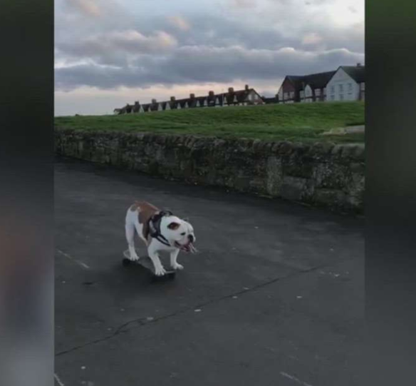 After learning how to ride a skateboard, this bulldog now likes to move around on the wheels more than he likes to walk around.