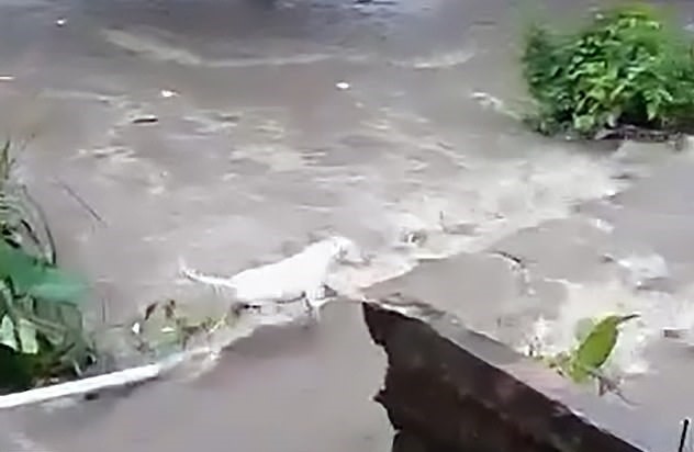 A dog owner has gone viral after jumping directly into a raging torrent in order to save the life of his pooch after the animal fell into the river caused by a rainstorm.