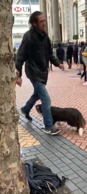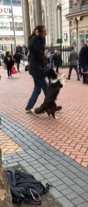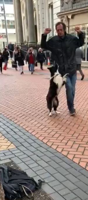 The dog that along with his master is performing on the street is incredibly involved in his act and is performing so well.