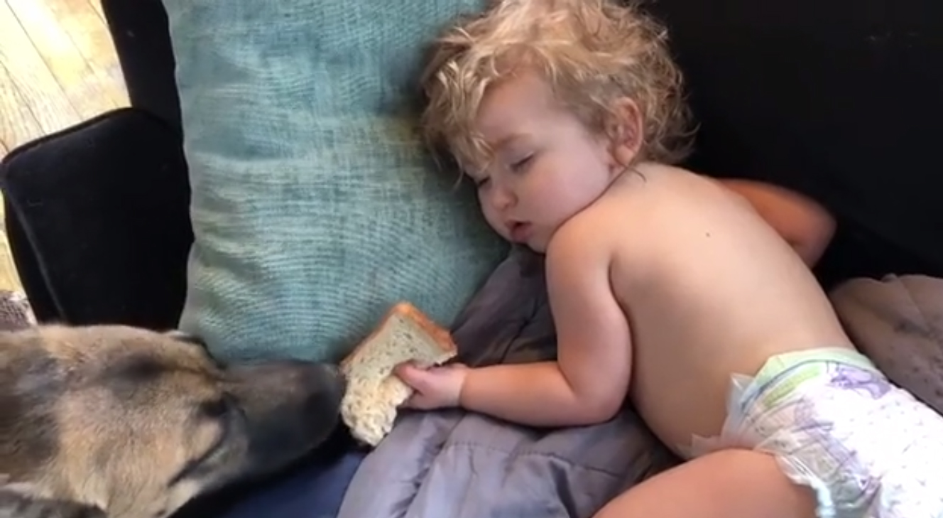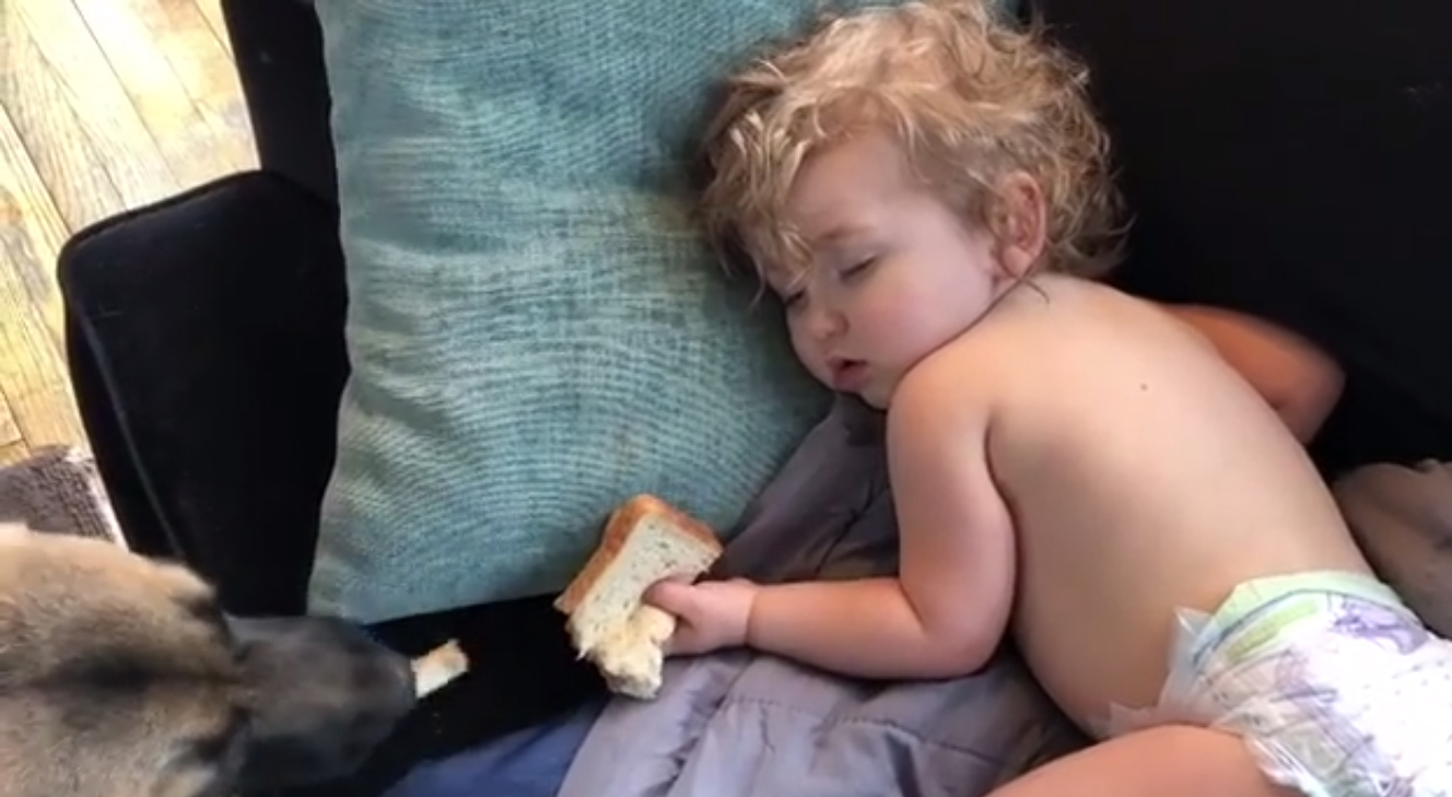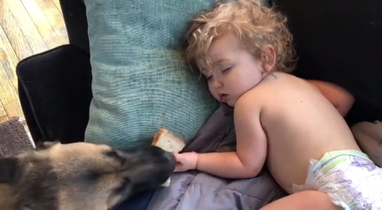 Have you seen a baby falls asleep with a sandwich in his hands? And the dog comes to help him!