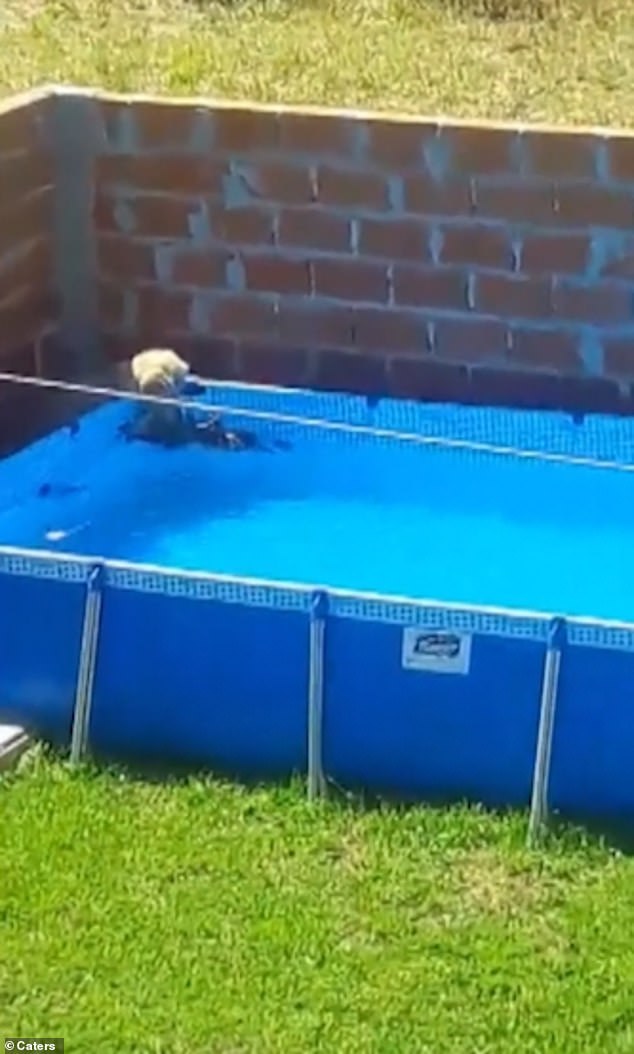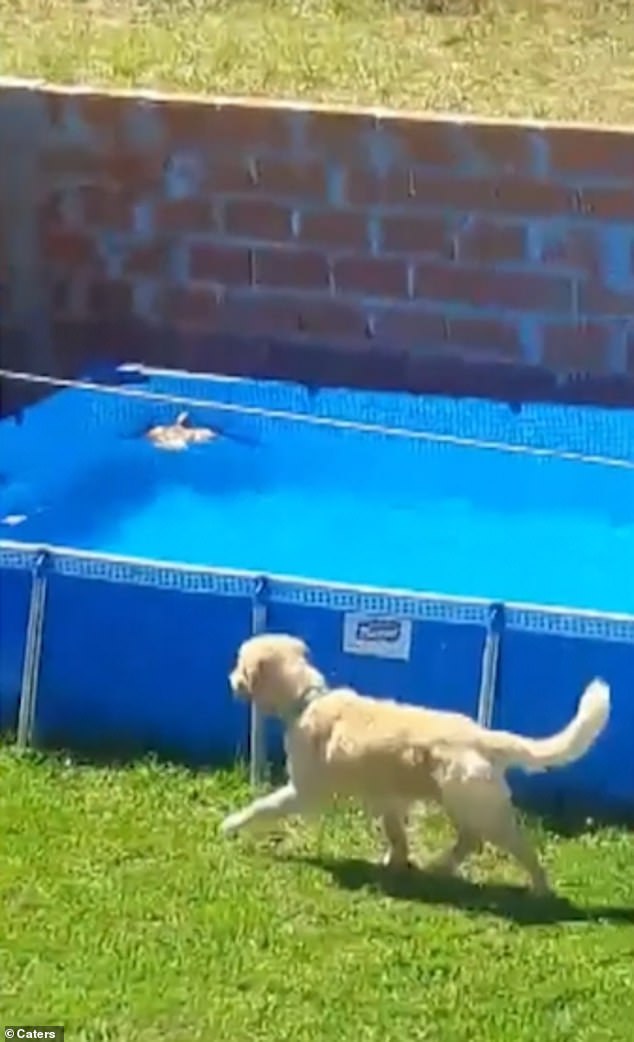 A Golden Retriever named Yago was caught on camera saving a bird from drowning in a paddling pool by his owner Mariana Corti.