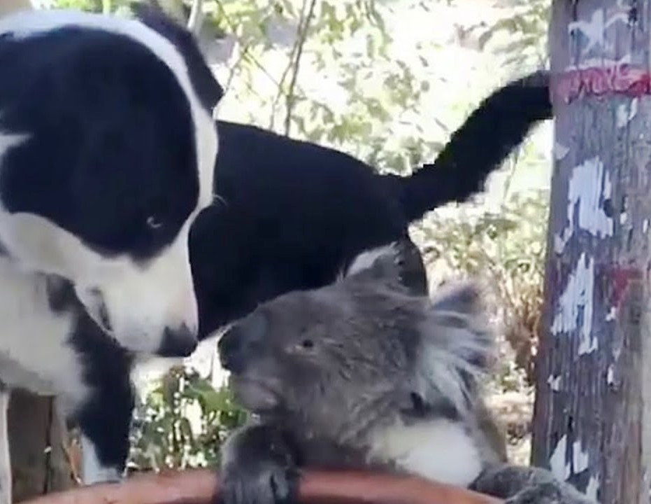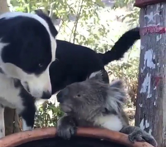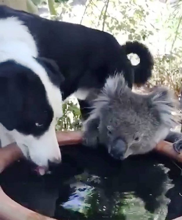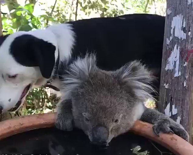 This is a heartwarming moment Rusty the family dog shared his drinking water with a very thirsty koala amid the drought and bushfire crisis in Australia.
