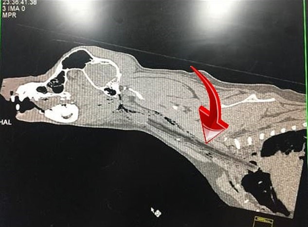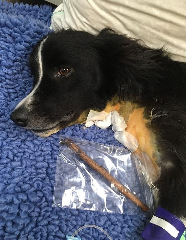 Vets immediately realized that the pooch had accidentally swallowed a stick and shared images of it on Facebook. The photos show how far the stick had been stuck down the dog’s throat.