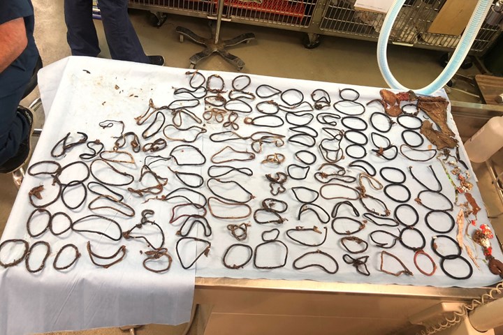 The family’s vet Dr. Randall Murray performed emergency surgery and found 117 hair ties weighing 2lbs from his stomach.
