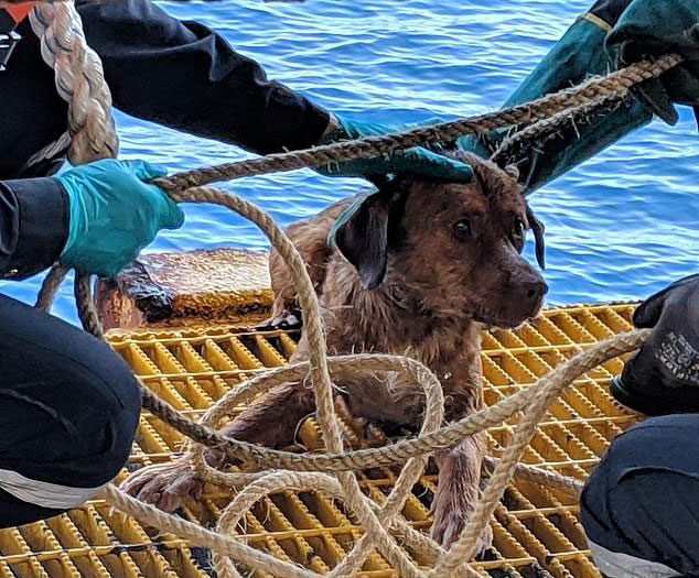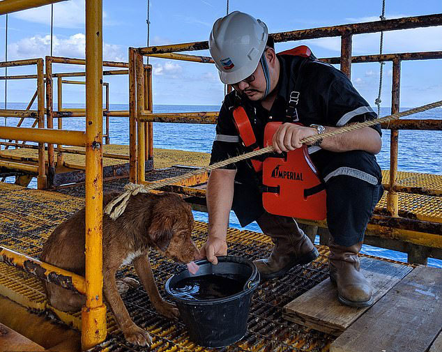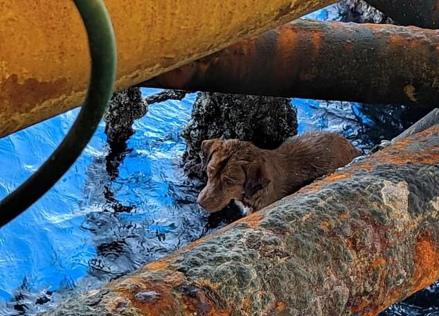 The dog was captured in a video where he is crawling onto the rusty bars of the rig, workers had called out to her as she swam towards them.