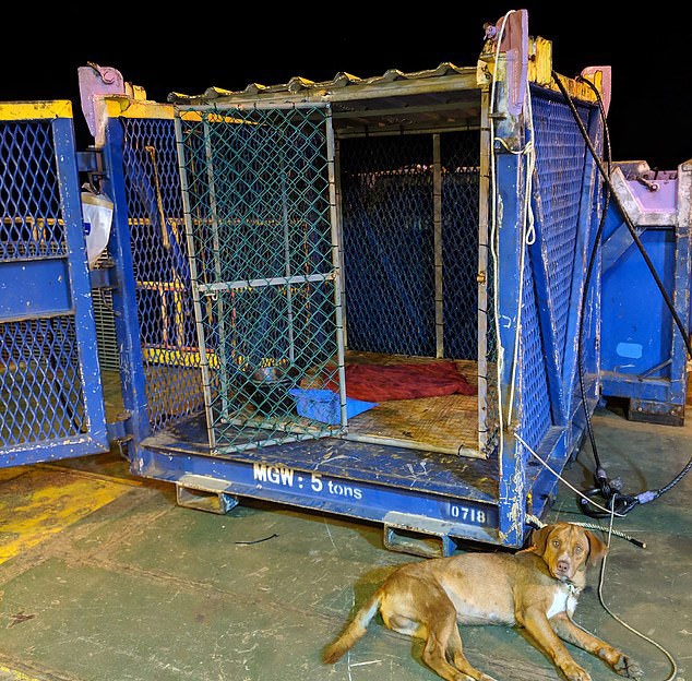 The special cage was welded together to carry the dog until he stayed on the drilling platform for two nights while and the staff gave it food and water.