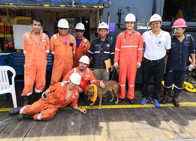 A poor dog was pulled to safety by oil rig workers who spotted it swimming in the Gulf of Thailand, 135 miles from the coast.