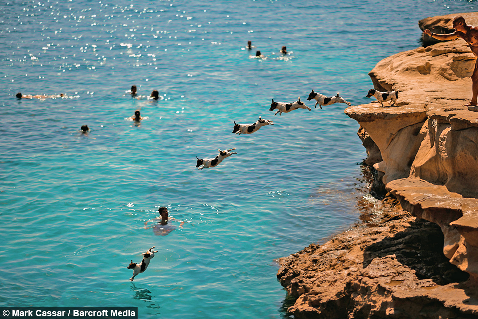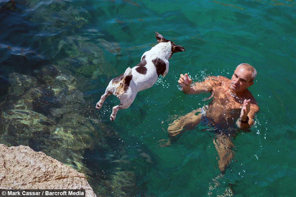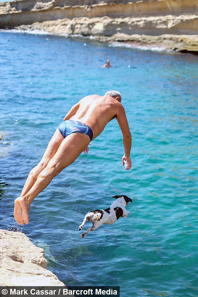 This video shows a diving dog jumping from a clifftop into St Peter’s Pool in Malta with her owner.