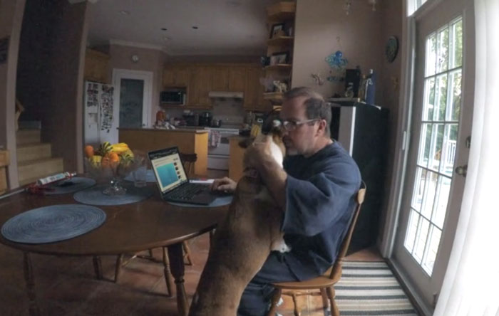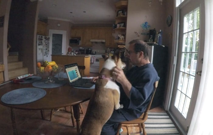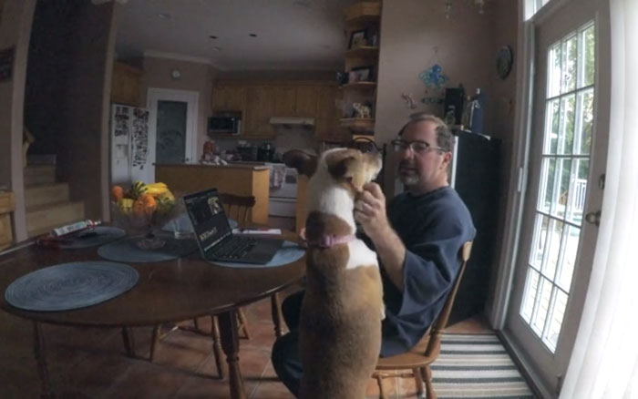 Brent was busy in the kitchen but Poncho wanted her owner’s attention. She roamed around the kitchen area to get attention. She kept nudging his arm to get his attention.