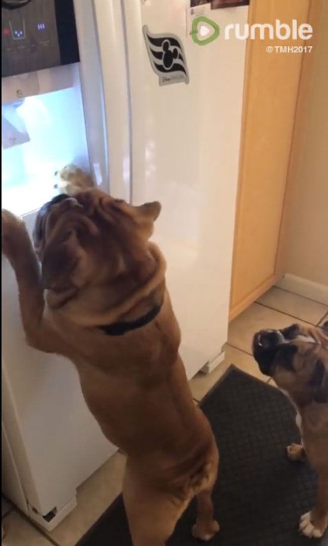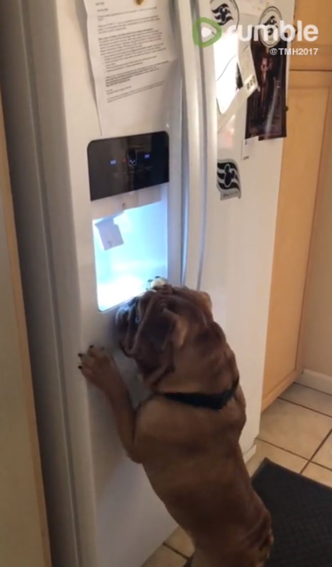 This smart dog named Tank knows how to use the refrigerator’s ice machine.