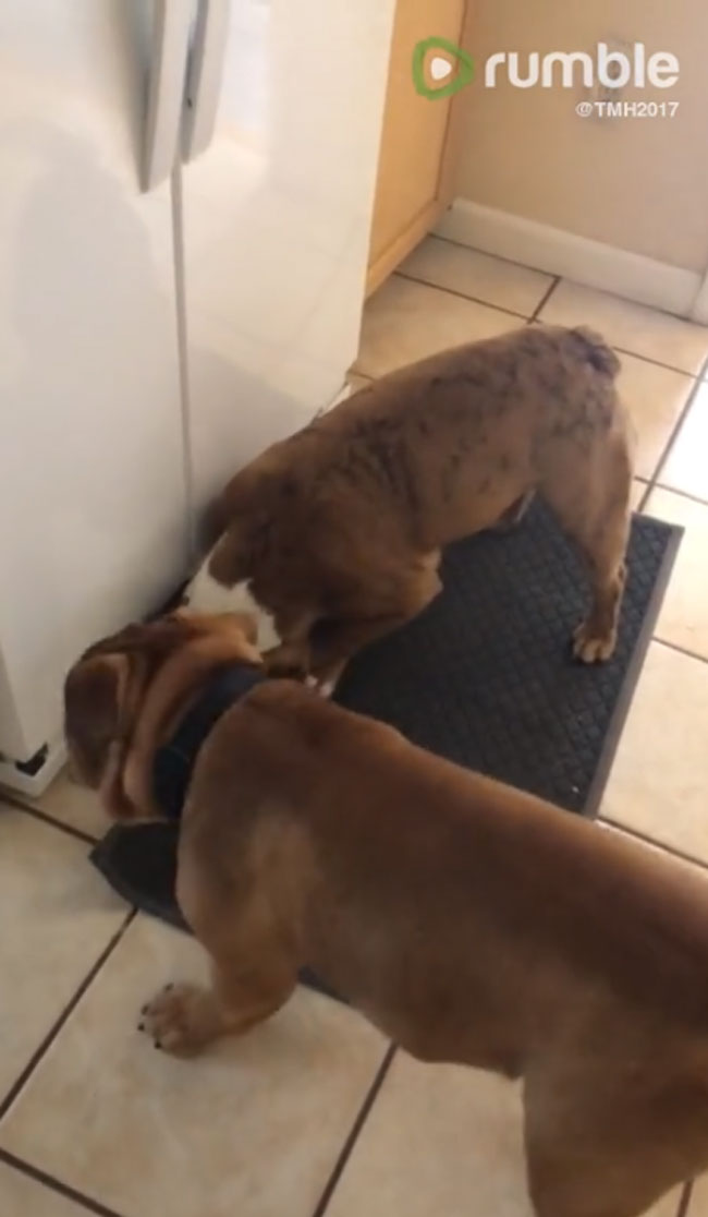 The dog does it so excitingly. It shows how much he loves getting his ice by himself but his buddy is not letting him have it.