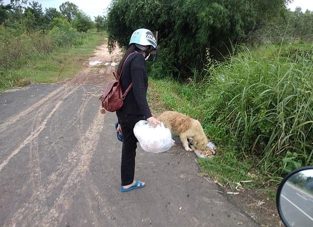 It was Anuchit Uncharoen who saw the dog on the side of the road in the Mueang District in Thailand. The pooch, who appeared very thin and had a skin condition, was being fed by Saowalak Pinnuchawet, one of the locals.